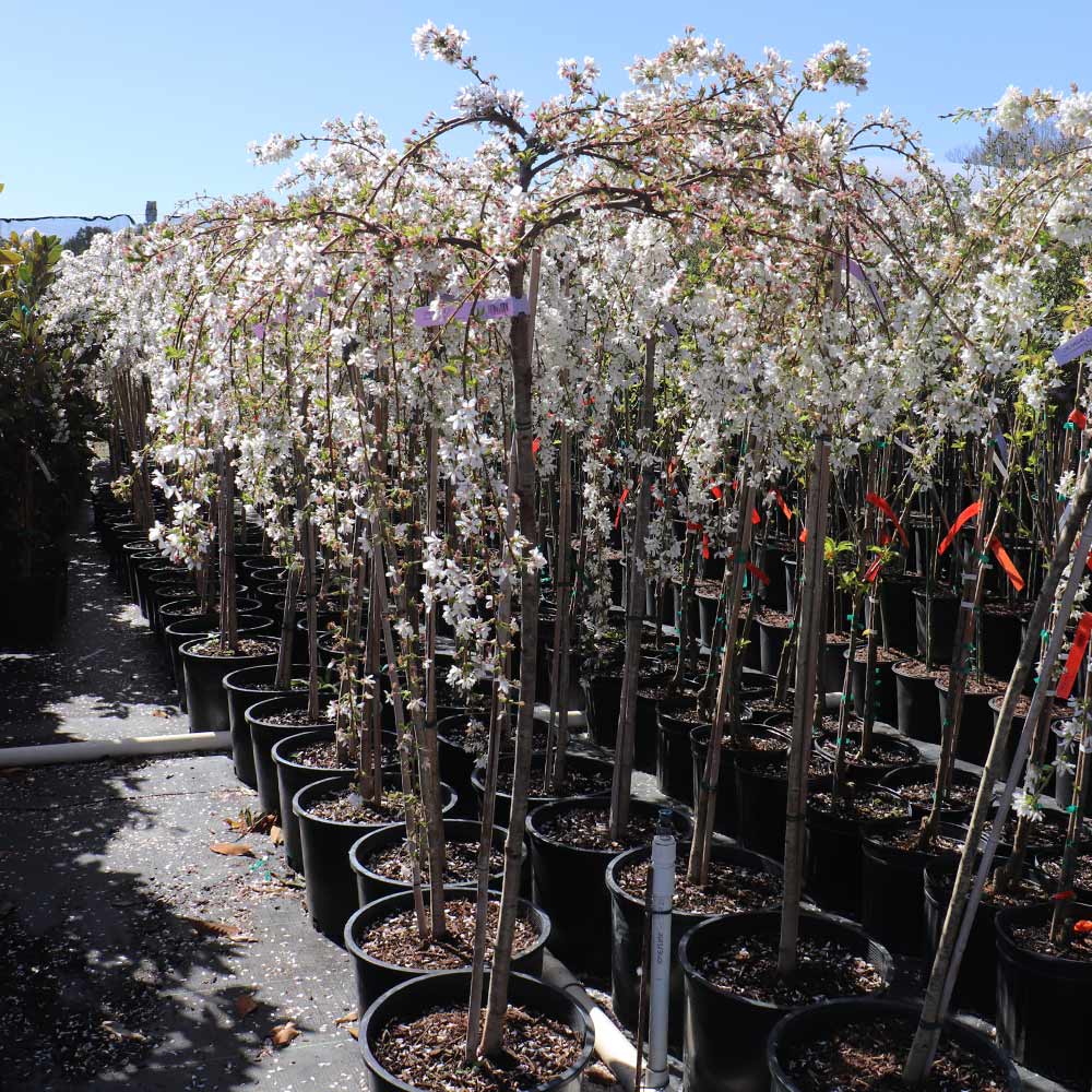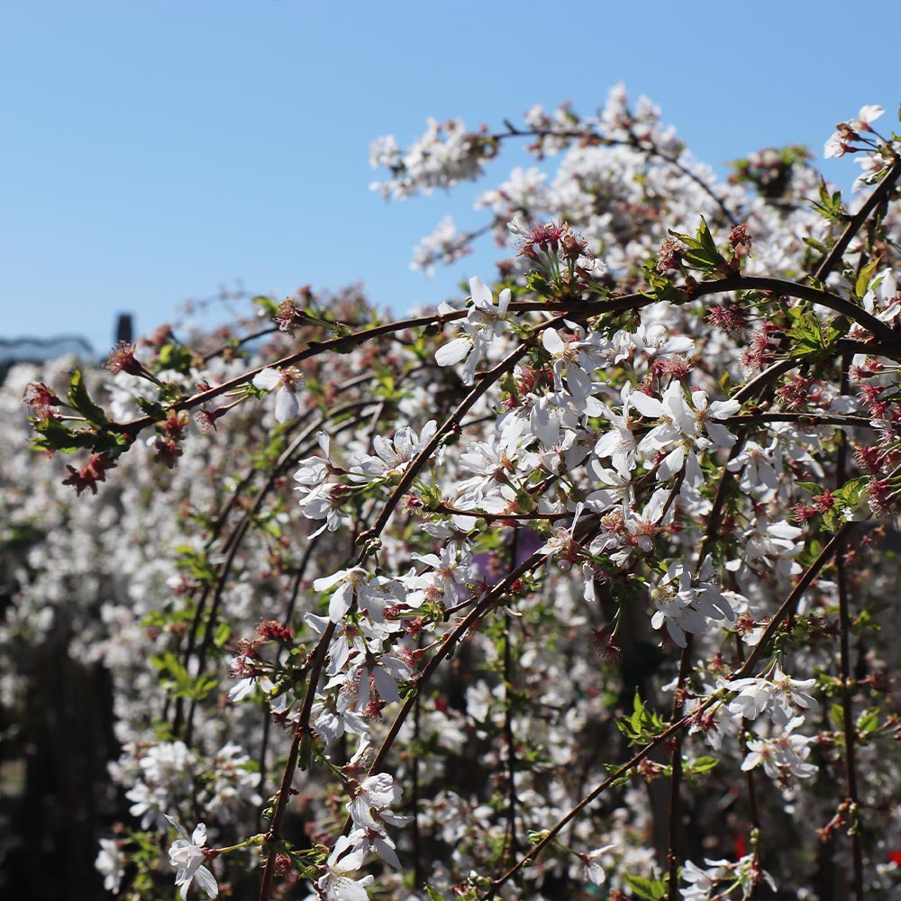 Low maintenance Snow Fountain Weeping Cherry Trees are a favorite among the north because they’re cold hardy and heat resistant. They are cold hardy to zone 5 and will flourish under heavy layers of ice and snow. Your summers will be worry-free while your drought-tolerant Snow Fountain Weeping flourishes without the need to be constantly checked on.