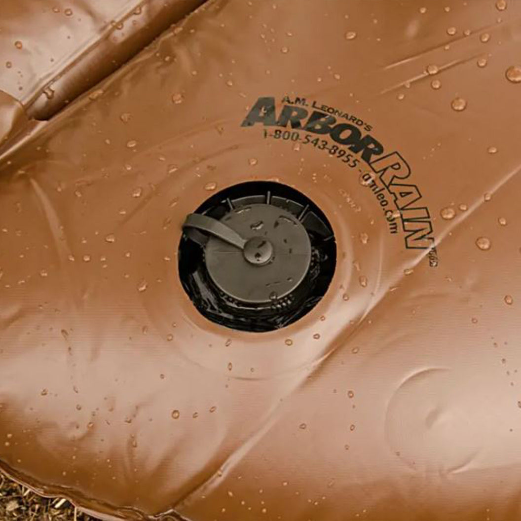 Note: The Slow Release Watering Ring releases water from two elbow-shaped PVC emitters. If the bag is emptying faster than expected, make sure it is completely full of water and check that the emitter nozzles are inserted correctly and not missing. Placing the bag on a flat surface can help regulate watering; it will drain faster when placed on a slope.
