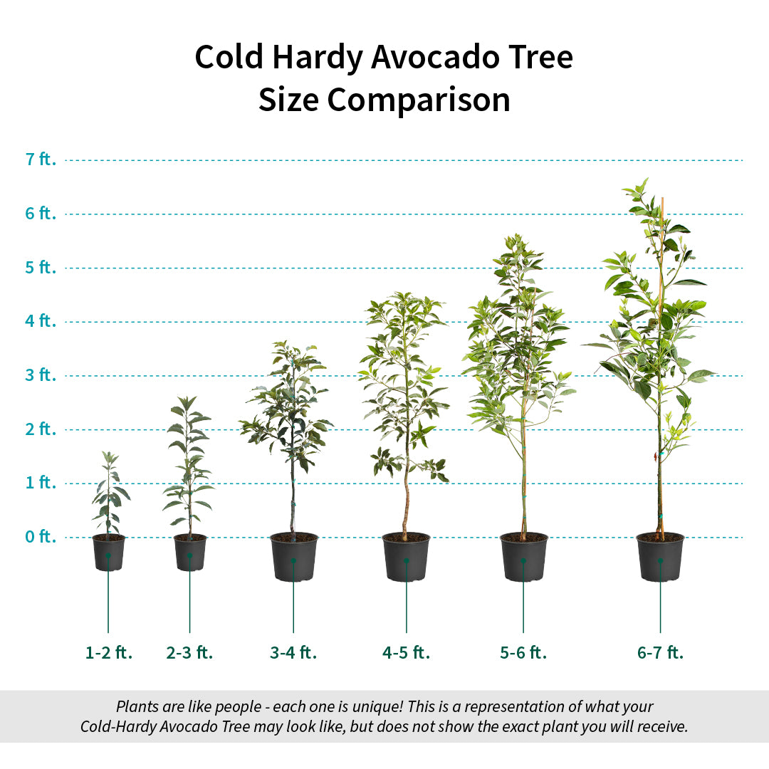 So, the Cold Hardy Avocado Tree is one of the most versatile trees on the market. For a larger tree, plant it outdoors and watch it soar to heights of 15 to 20 feet. Or, for a shorter tree, plant in a container and you can limit growth to between 5 and 7 feet in height. Many growers find this method optimal for moving the tree between indoors and out.