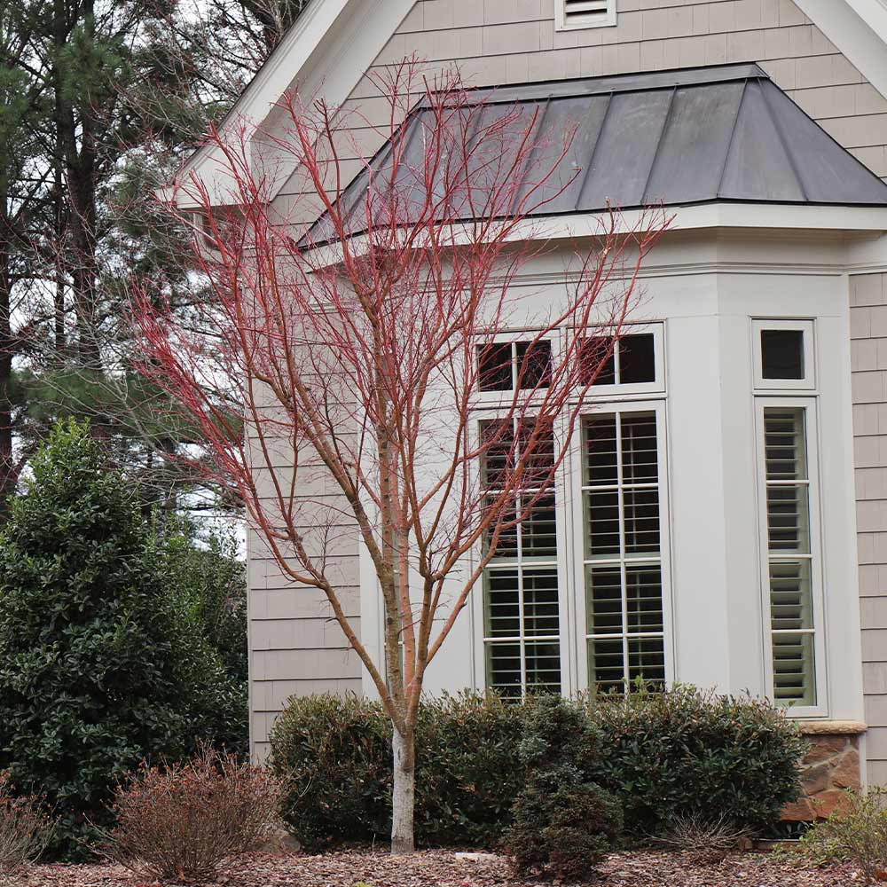 Intense red color, even in the winter - the Coral Bark Japanese Maple Tree makes the ultimate statement. Bright red bark adds a spark of personality throughout the winter months. It grows upright and while it's on the larger scale compared to most Maples, it is compact and ideal for small yards...and even patios.